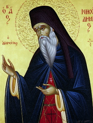 О богодохнове́нный и вселе́нский и́стины учи́телю, изря́дная Святоимени́тыя Горы́ похвало́, светле́йшая звездо́ Правосла́вныя Це́ркве Собо́рныя, всепреподо́бный и святы́й о́тче Никоди́ме! Да́ждь нам просвеще́ние моли́твами твои́ми во исполне́ние боже́ственныя во́ли, напра́ви стопы́ на́ша ко стезя́м доброде́тельнаго жития́, осени́ нас да́нною тебе́ благода́тию и вразуми́ ум наш, во е́же разуме́ти богому́драя поуче́ния твоя́, да обря́щем в них покая́ние, исцеле́ние, ра́дость, мир, кро́тость, поко́й, любо́вь, и а́ще что добро́ и бла́го и спаси́тельно, и в конце́ живо́т ве́чный, и моли́ся всегда́ ко Го́споду о всех нас, и́скренне лю́бящих тя и на всяк день и час призыва́ющих оте́ческую твою́ бла́гость и по́мощь. Аминь.