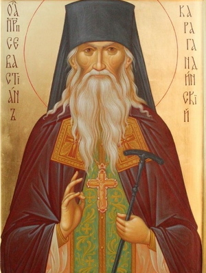 О, пречестна́я и свяще́нная главо́, благода́ти Свята́го Ду́ха испо́лненная, Спа́сово со Отце́м обита́лище, ста́рцев о́птинских учениче́ и прее́мниче, гра́да Караганды́ светле́йшее украше́ние, Казахстанския страны́ богодарова́нный моли́твенниче, Це́ркви Ру́сския па́стырю богопросла́вленный, си́рым и вдови́цам засту́пниче, немощны́х врачу́ безме́здный, пра́вило ве́ры и благоче́стия, преподо́бных сожи́телю и му́чеников соприча́стниче, богоно́сне о́тче на́ш Севастиа́не досточти́ме! К тебе́ усе́рдно прибега́я, моле́ние те́плое прино́сим: от сокро́вищницы твоея́ пода́ждь и на́шему убо́жеству; смире́нием твои́м на́шу горды́ню низложи́; безстра́стием на́ша стра́сти попали́; бо́дрствованием ле́ности на́вык от на́с отжени́; сле́зными то́ки на́ше нечу́вствие пробуди́; бде́нием от нераде́ния на́с возста́ви; моли́твами и в на́с пла́мень моли́твы возжги́; любо́вию на́с братолю́бны сотвори́; пода́ждь же на́м ду́х кро́тости и смире́ния, ду́х чистоты́ и благоче́стия; от страсте́й многонеду́жия на́с свободи́ и ко и́стинному покая́нию приведи́. Ты́ бо во уме́ твое́м непреста́нно име́л еси́ на Кресте́ Распя́вшагося за на́с Сы́на Бо́жия, Того́ сладча́йшее И́мя во уме́ и в се́рдце непреста́нно име́ти и на́с научи́, да любо́вию Тому́ пламене́я, стра́шный о́ный де́нь су́дный сре́тити угото́вимся, и в Ца́рствие Небе́сное вни́ти с тобо́ю сподо́бимся, сла́вити и воспева́ти Триеди́ную держа́ву Бо́га на́шего: Отца́ и Сы́на и Ду́ха Свята́го во ве́ки. Ами́нь.