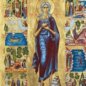 Греха́ мглы избежа́вши,/ покая́ния све́том озари́вши твое́ се́рдце, сла́вная,/ пришла́ еси́ ко Христу́,/ Сего́ Всенепоро́чную и святу́ю Ма́терь/ Моли́твенницу ми́лостивную принесла́ еси́./ Отону́дуже и прегреше́ний обрела́ еси́ оставле́ние,// и со А́нгелы при́сно сра́дуешися.