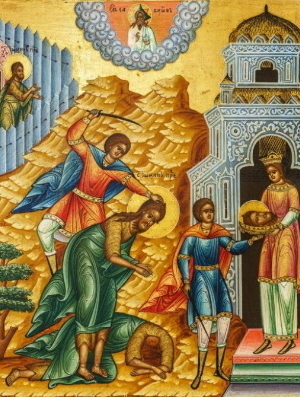 Предте́чево сла́вное усекнове́ние,/ смотре́ние бысть не́кое Боже́ственное;/ да и су́щим во а́де Спа́сово пропове́сть прише́ствие./ Да рыда́ет у́бо Ироди́а,/ беззако́нное уби́йство испроси́вши:/ не зако́н бо Бо́жий, ни живы́й век возлюби́,// но притво́рный, привре́менный.